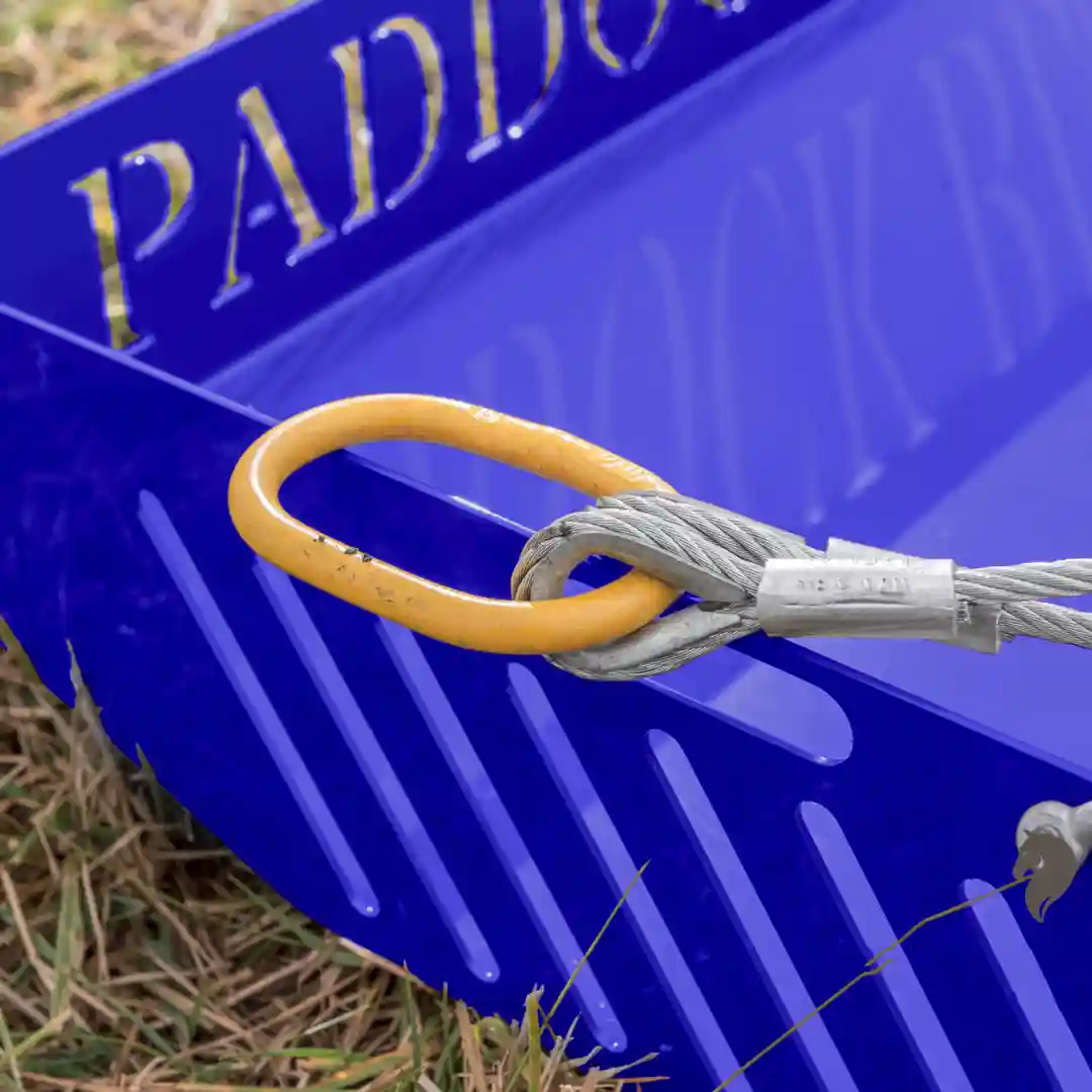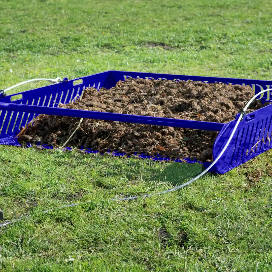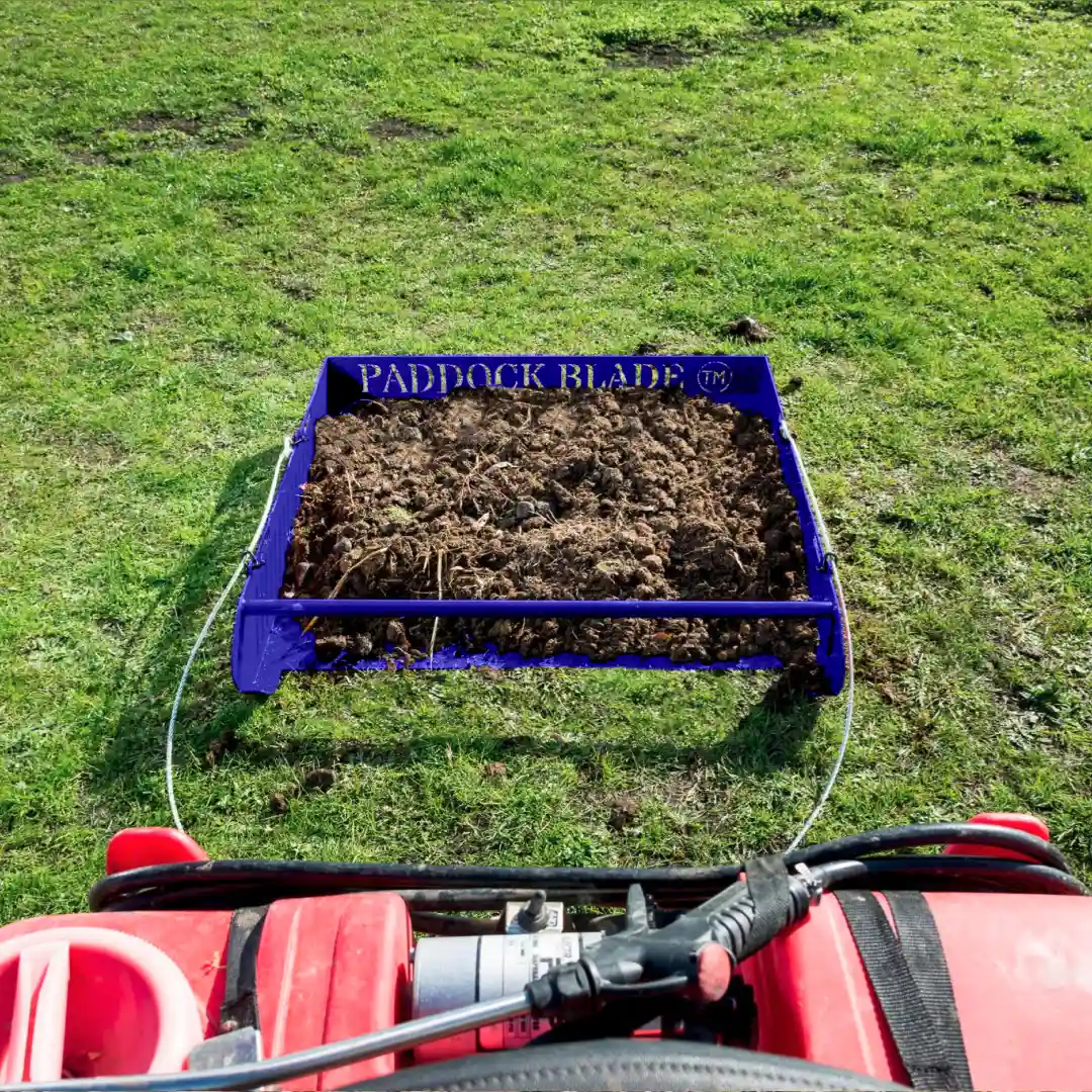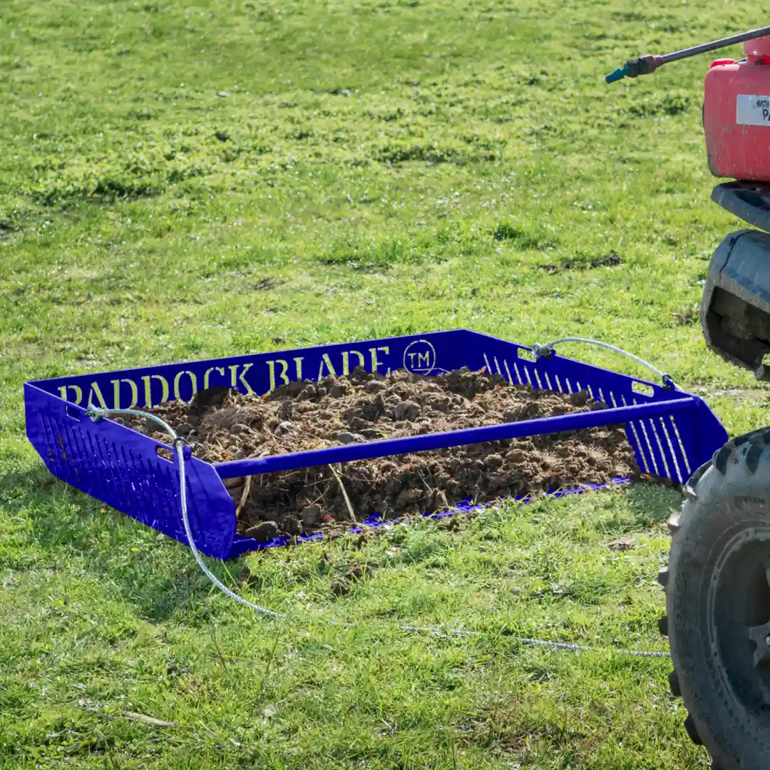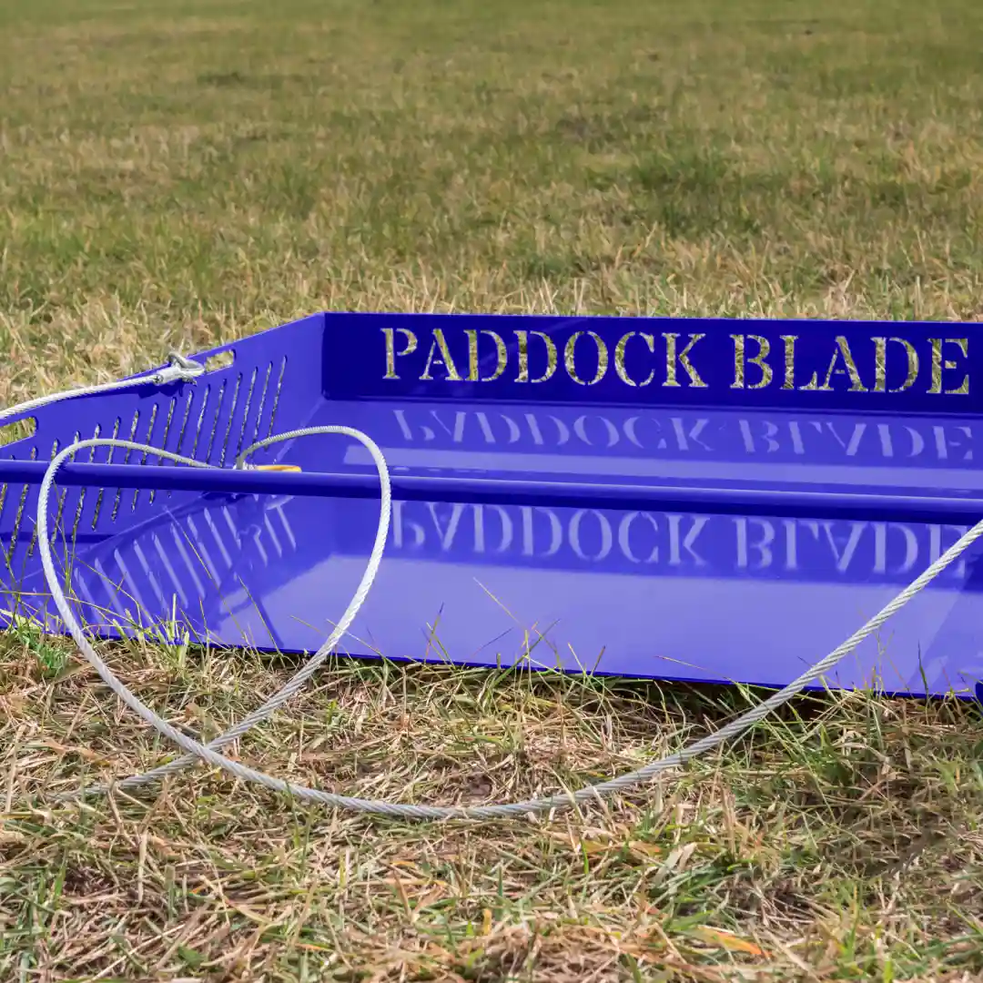 Descubra el recogedor de estiércol Paddock Blade en un NUEVO e impresionante color azul: la solución más rápida, sencilla y eficaz para la limpieza de los prados. Fabricado con orgullo en Gran Bretaña a partir de acero de primera calidad, este robusto diseño de 45 kg recoge estiércol, piedras, palos y residuos orgánicos con facilidad. Ahorra hasta 70% de su tiempo de limpieza y no requiere mantenimiento gracias a su construcción sencilla y sin necesidad de montaje. Con una capacidad de 35 litros (más de 3,5 carretillas) y la posibilidad de transportar cargas de hasta 500 kg, es más que un simple recogedor de estiércol. Remolcable con cualquier ATV, cortacésped o vehículo pequeño, el Paddock Blade le devuelve un tiempo valioso para disfrutar de sus caballos.