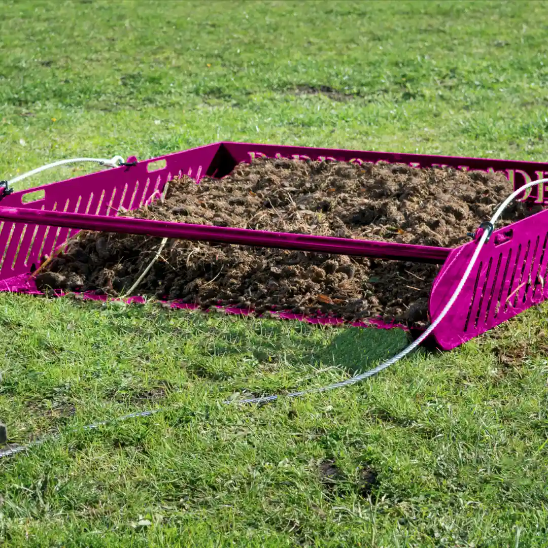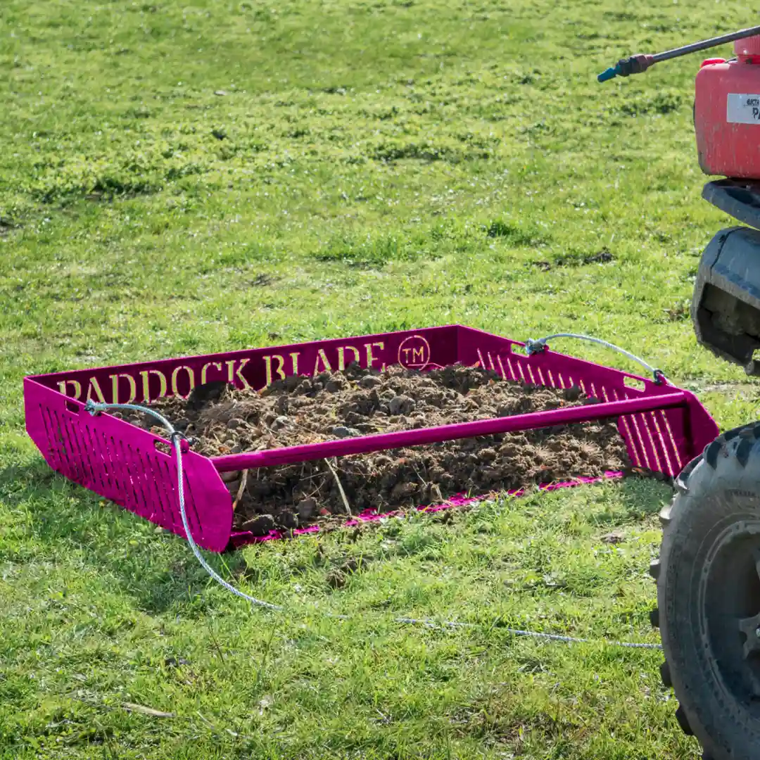 Apportez une touche de couleur à l'entretien de vos paddocks avec le NOUVEAU Pink Paddock Blade. En tant que nettoyeur de paddock européen original, il est conçu pour rendre le ramassage du fumier plus rapide, plus facile et beaucoup moins exigeant en termes de main-d'œuvre. Fabriqué en acier britannique de première qualité, ce collecteur de 45 kg est durable, robuste et couvert par une garantie à vie. D'une capacité de 35 litres (soit plus de 3,5 brouettes), il ramasse le fumier, les pierres, les bâtons et les déchets organiques sans effort sur les terrains plats, irréguliers ou accidentés. Remorquable avec n'importe quel VTT, tondeuse ou petit véhicule, il peut même servir de remorque pour des charges allant jusqu'à 500 kg, ce qui vous permet de gagner du temps tous les jours.